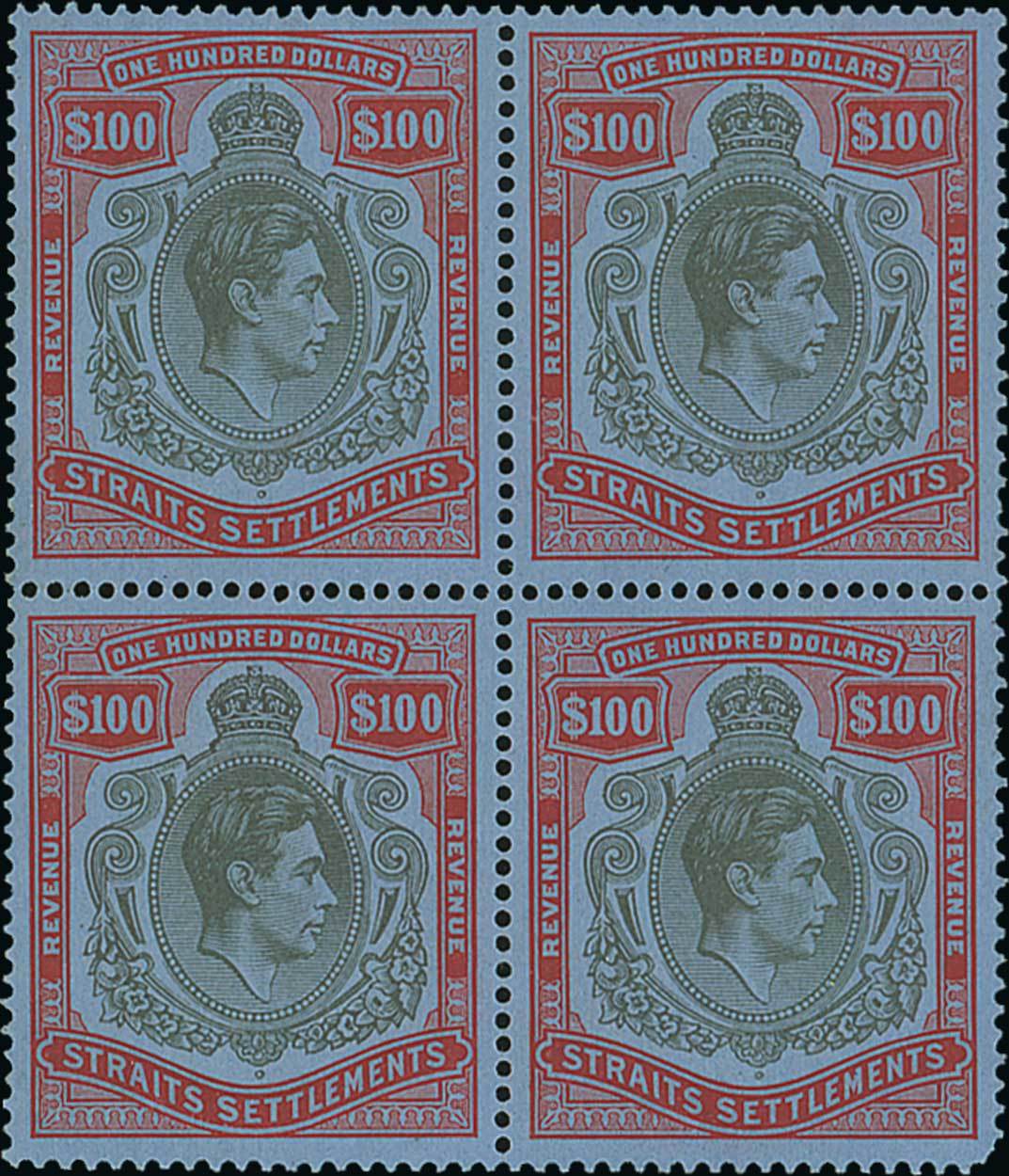 1938 $100 black and carmine on blue, a block of four with large part original browned gum; a few split perfs at foot and the lower rightbstamp with slightly rounded corner and with thin at right. Very fine appearance and the largest recorded mint multiple. Photo