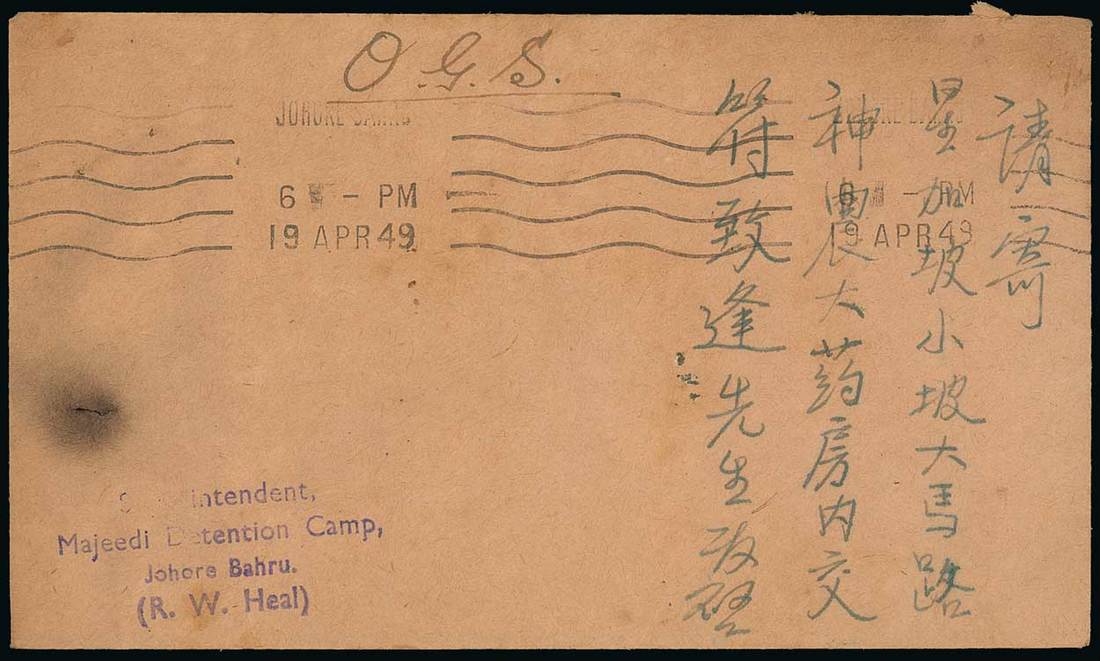 1949 (19 Apr.) OGS envelope from Johore Bagru to Singapore, showing machine d.s. and "Sperintendent,/Majeedi Detention Camp,/Johore Bahru./(R.W. Heal)" handstamp in violet; the envelope a little soiled and with small burn? mark at left. Very scarce. Photo