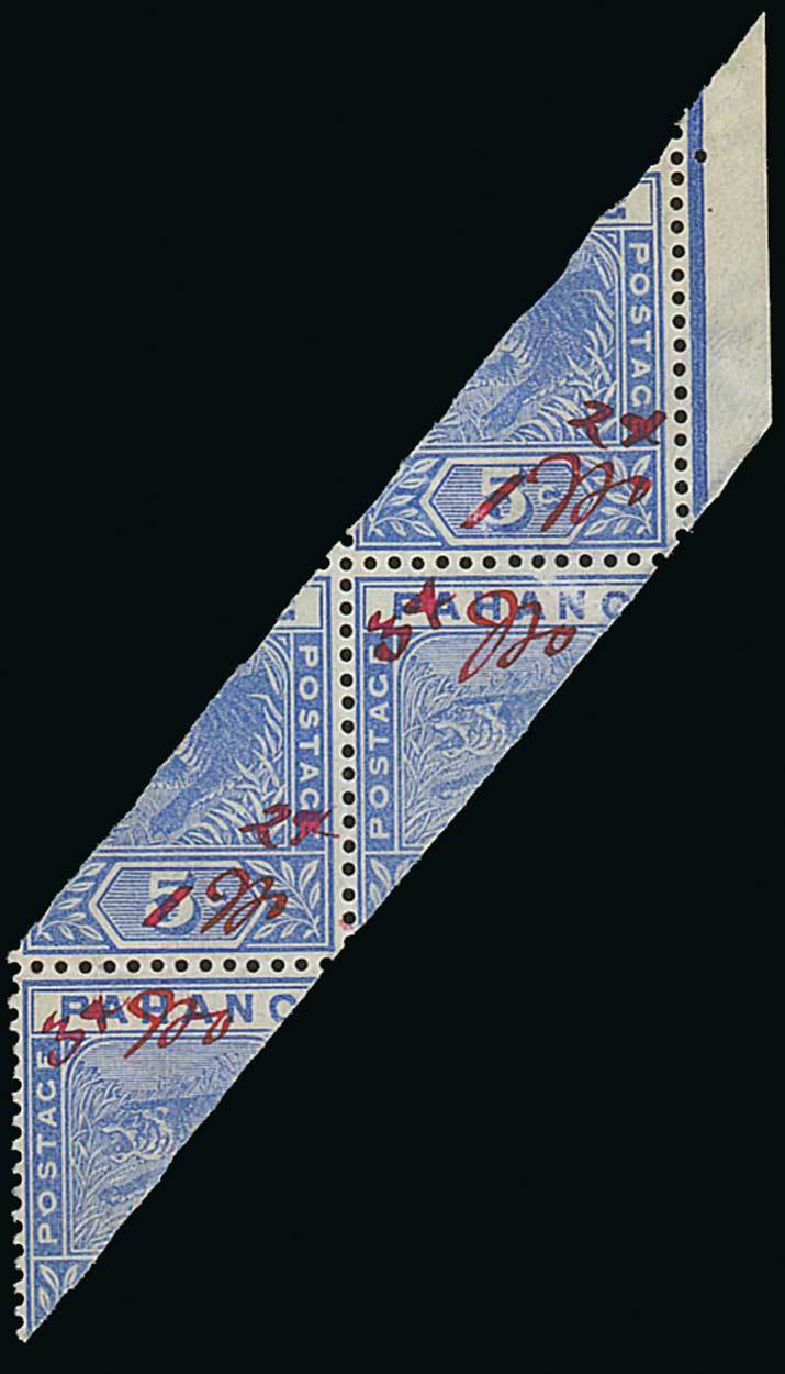1897 (2 Aug.) Kuala Lipis Provisional, 2c. on half 5c. blue and 3c. on half 5c. blue, a marginal se-tenant strip of four, unused with large part original gum, one with horizontal crease otherwise fine. A rare multiple. R.P.S. Certificate (2016). S.G. 18b, £9000. Photo
