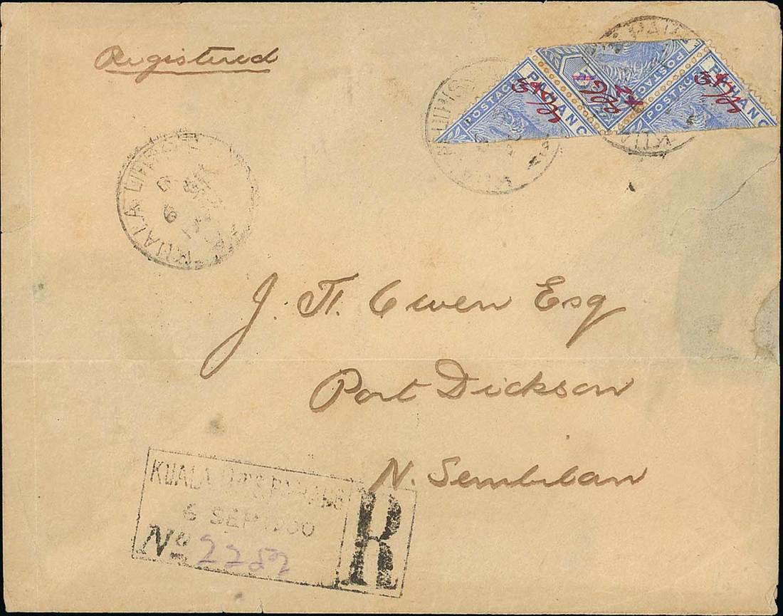 1897 (2 Aug.) Kuala Lipis Provisional, 2c. on half 5c. blue and 3c. on half 5c. blue, a se-tenant strip of three tied by "kuala lipis" c.d.s. on 1900 (6 Sept.) "J.T. Owen" envelope registered to Port Dickson, showing registration d.s. and, on reverse, Kwala Kubu (9.9) and arrival (11.9) datestamps; the envelope with some faults at caused through opening, none of which significantly affect the appearance. R.P.S. Certificate (2016). S.G. 18b/18d. Photo