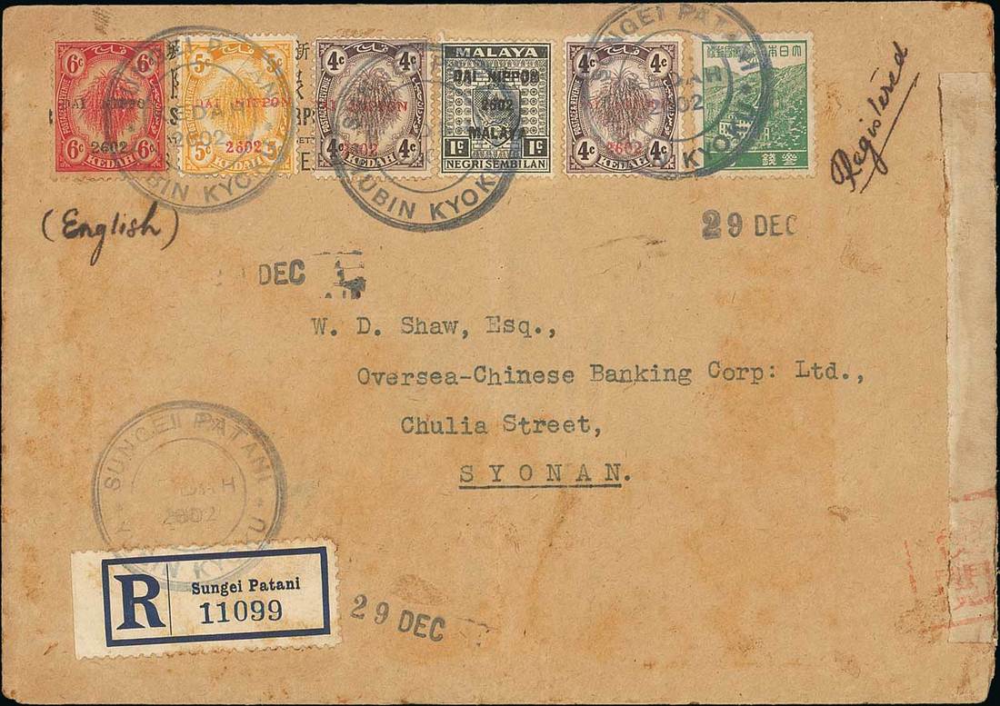 1942 (29 Dec.) envelope registered from Sungei Patani to Singapore, bearing 1942 Dai Nippon 4c. (2), 5c. and 6c., Dai Nippon on Negri Sembilan 1c. and Japan 3s., all tied by "sungei patani/kedah/2602/yubin kyoku" circular handstamp (Proud Type JD2), showing registration label and censor label at right with arrival datestamp on reverse; some minor discolouration and central vertical fold which crosses the 1c.