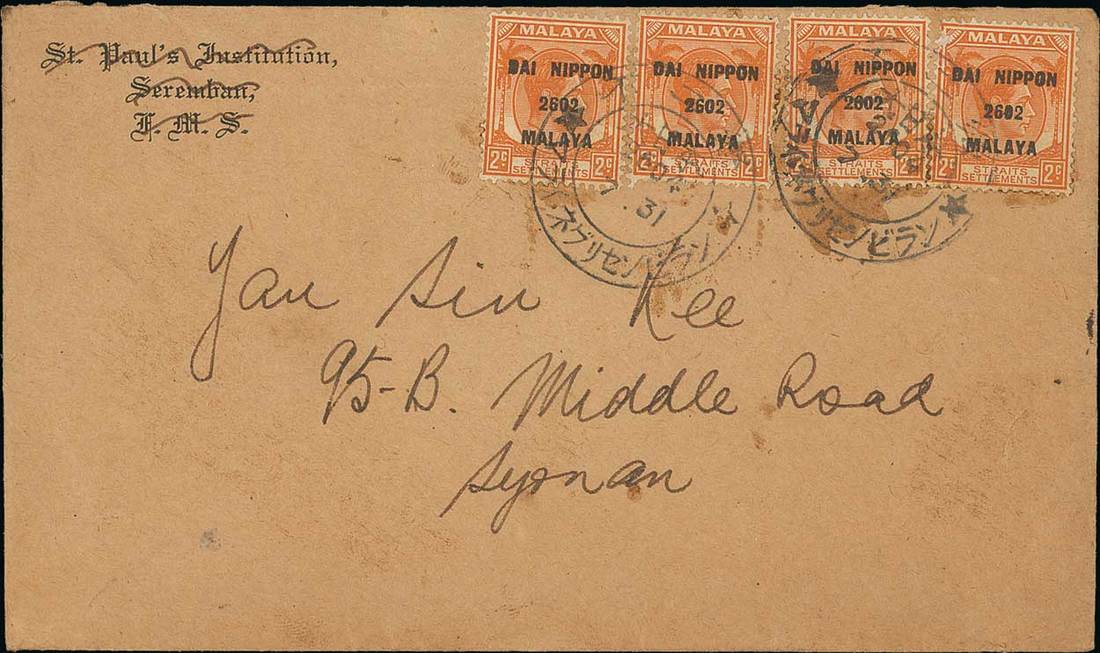 1944 (31 July) envelope to Singapore, bearing 1942 Dai Nippon on Straits Settlements 2c. (4, one with small surface abrasion at top left) clearly tied by Fuji Go Japanese datestamp (Type JD2) and showing Censor chop on reverse. Rare. Photo