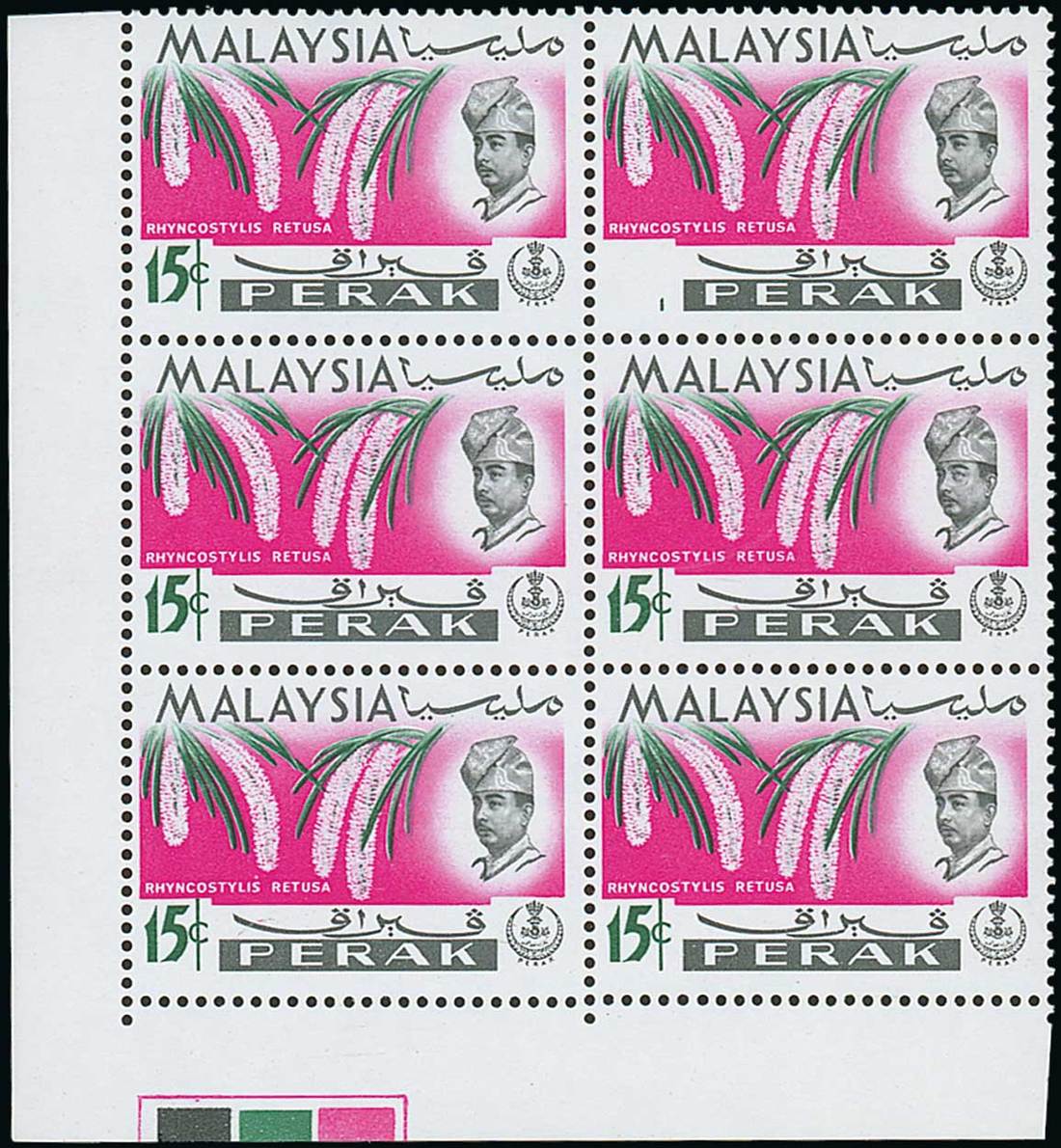 15c. lower left corner block of six (2x3) with colour bars, the top right stamp with green (value) omitted, fine unmounted mint. ISC 166f. Photo