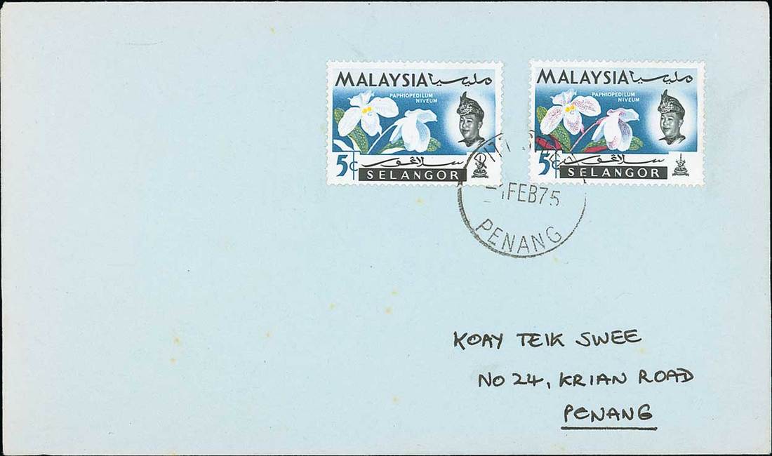 5c. with red (leaves etc.) omitted plus a normal tied by "pitt street/penang" on locally addressed 1975 (1 Feb.) envelope, fine. S.G. 138c, unpriced used. Photo
