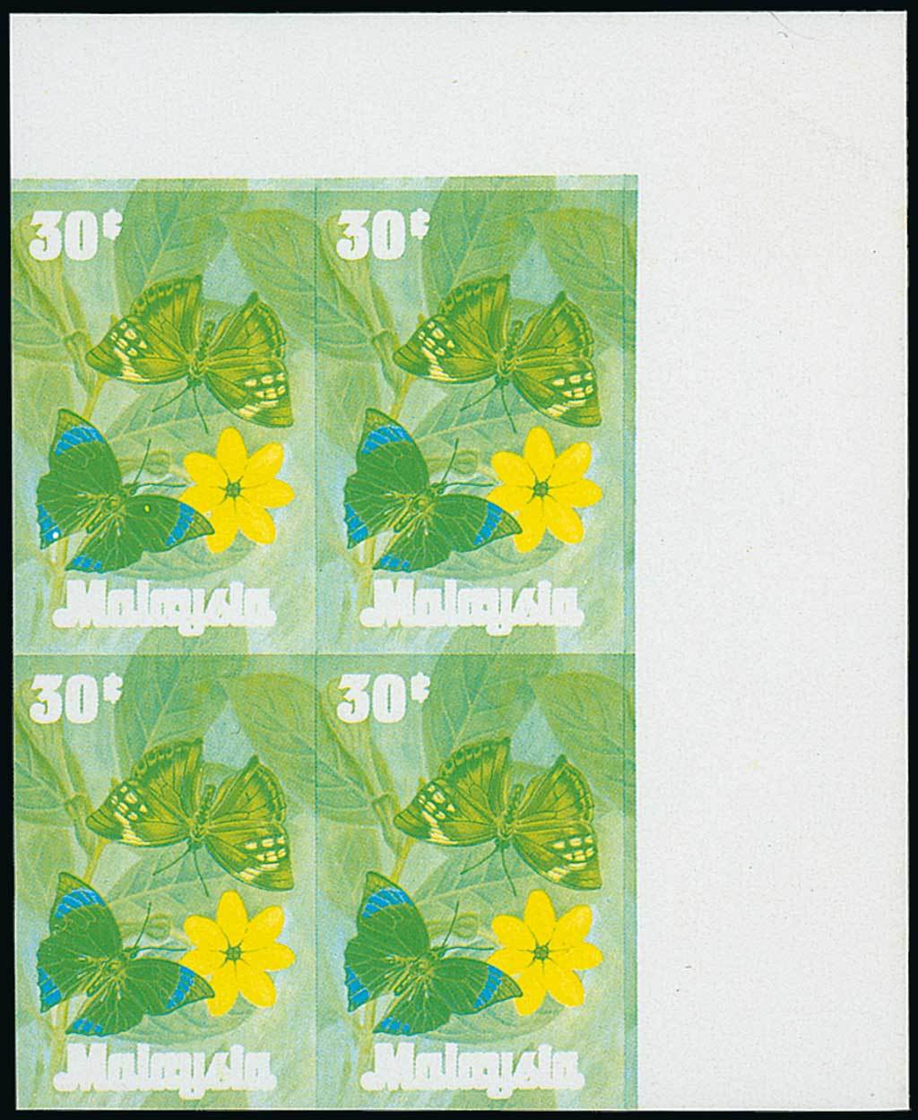30c., a gummed top right corner imperforate progressive proof block of four of the cyan and yellow separations, small piece of adhesive tape on the reverse of the top right corner, otherwise fine. Photo