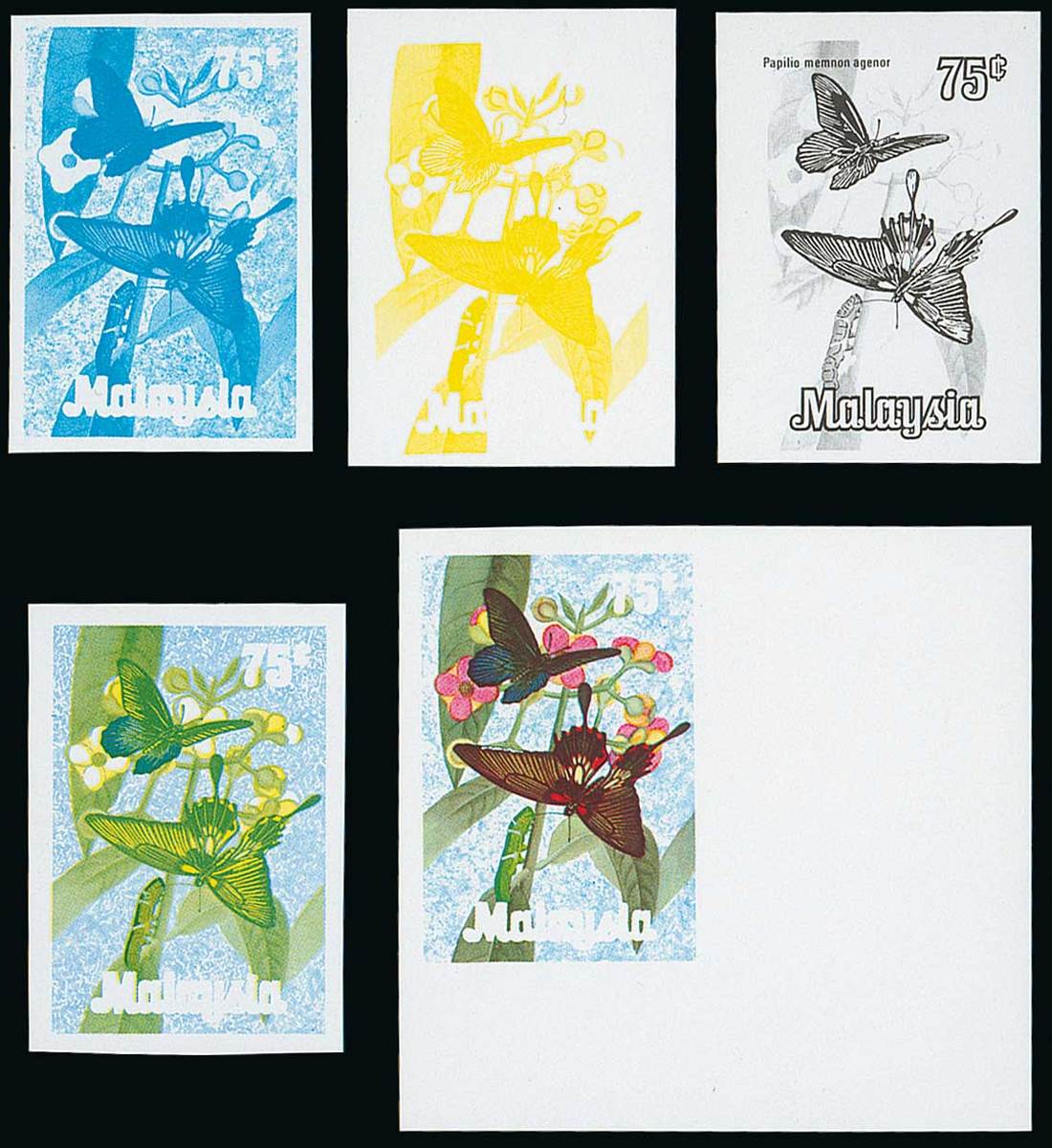75c. gummed imperforate colour separations (5) comprising cyan, yellow, black, cyan and yellow, and cyan, yellow and magenta (a lower right corner example), fine. Photo