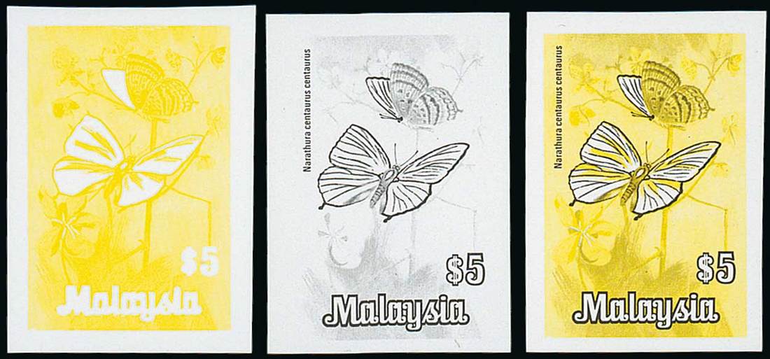 $5 gummed imperforate colour separations (3) comprising, yellow, black and yellow and black, fine. Photo