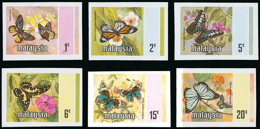 1c., 2c., 5c., 6c., 15c. and 20c. progressive imperforate proofs without the State name and Sultan's portrait or State Arms, fine. Photo