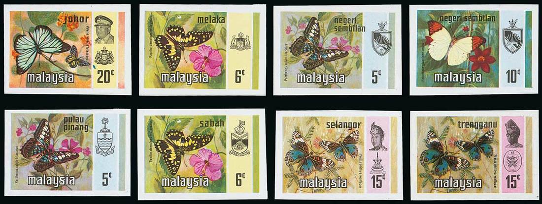 Johore 20c., Malacca 6c., Negri Sembilan 5c. and 10c., Penang 5c., Sabah 6c., Selangor 15c. and Trengganu 15c., each a gummed imperforate proof as issued, fine. Photo