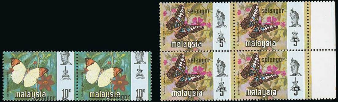 5c. marginal block of four and 10c. horizontal pair, both showing black (State inscription, portrait and arms) very misplaced, fine unmounted mint. Photo