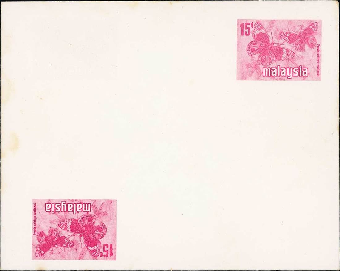 1971 Butterfly 15c. magenta stationery envelope, a trial printing showing a stamp impression at top right, lower left and inside, some minor soiling though believed the only known example; also two issued envelopes, one cancelled to order. Photo