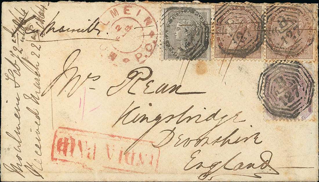 1864 (2 Feb.) envelope from Moulmein to England, marked "via Marseilles", bearing 1856 1a. pair, 4a. black and 1860 8p., the first three crossed by penstroke and all neatly cancelled by fine "B/127" obliterator, showing "moulmein/p.o." double-ring d.s. in red alongside, framed "india paid", maunuscript "1/-" in red and, on reverse, Calcutta, Bombay and arrival datestamps. A delightful franking. Photo