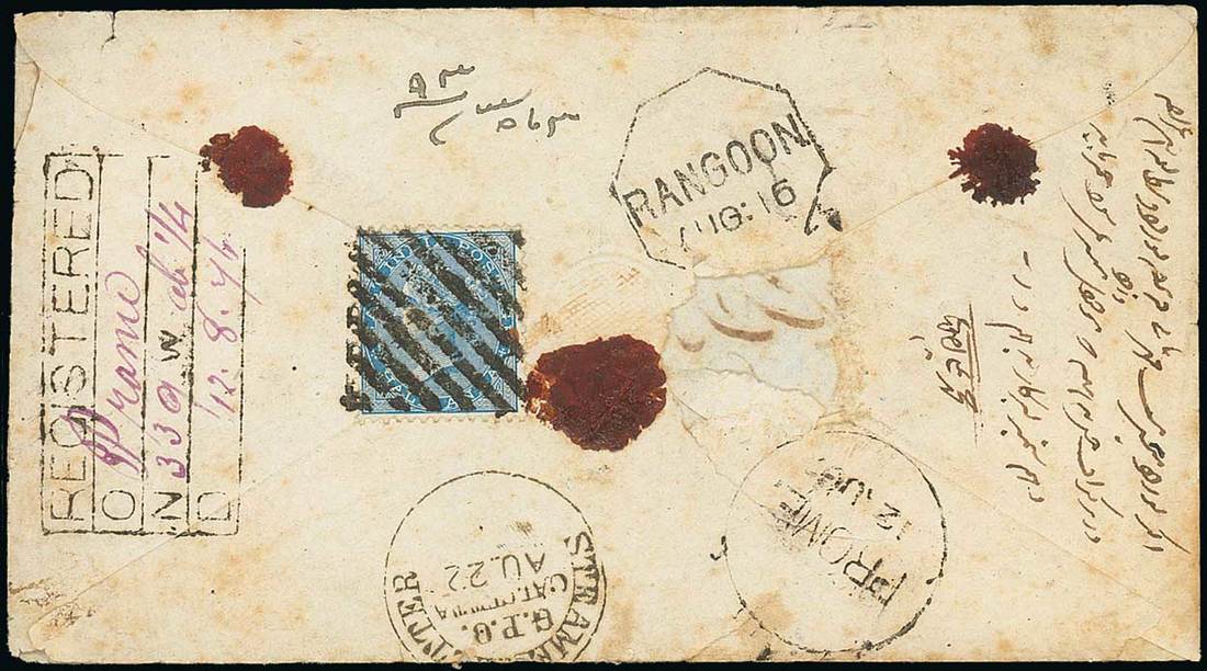 1876 (12 Aug.) envelope to Calcutta bearing, on reverse, 1872 ½a. tied by diamond of bars, showing "prome" c.d.s., Registration h.s. with manuscript "Prome" and date inserted, Rangoon transit d.s. and arrival c.d.s.; the back panel with small piece missing at centre. Photo