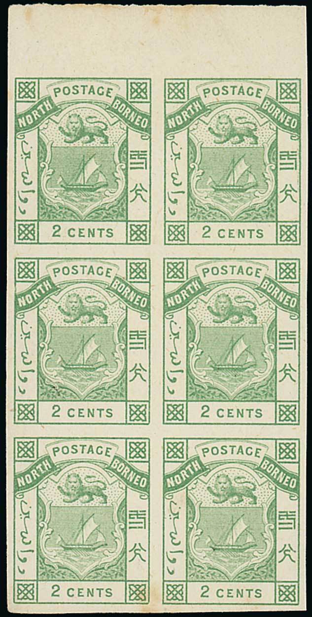 1883 2c. marginal imperforate colour trial block of six, [5-6/15-16/25-26], in green on thick unwatermarked wove paper, small stain at foot on reverse of [25-26] just showing bthrough to face, otherwise fine. Photo