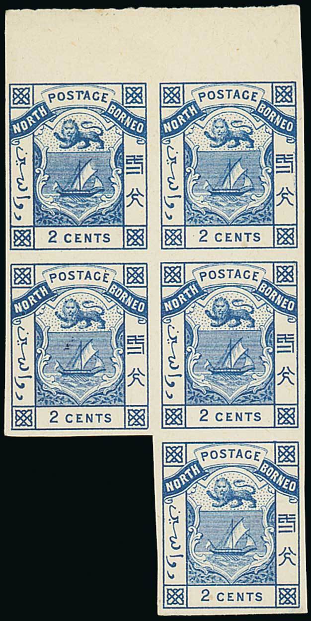 1883 2c. marginal imperforate colour trial block of five, [5-6/15-16/26], in blue on thick unwatermarked wove paper, fine. Photo