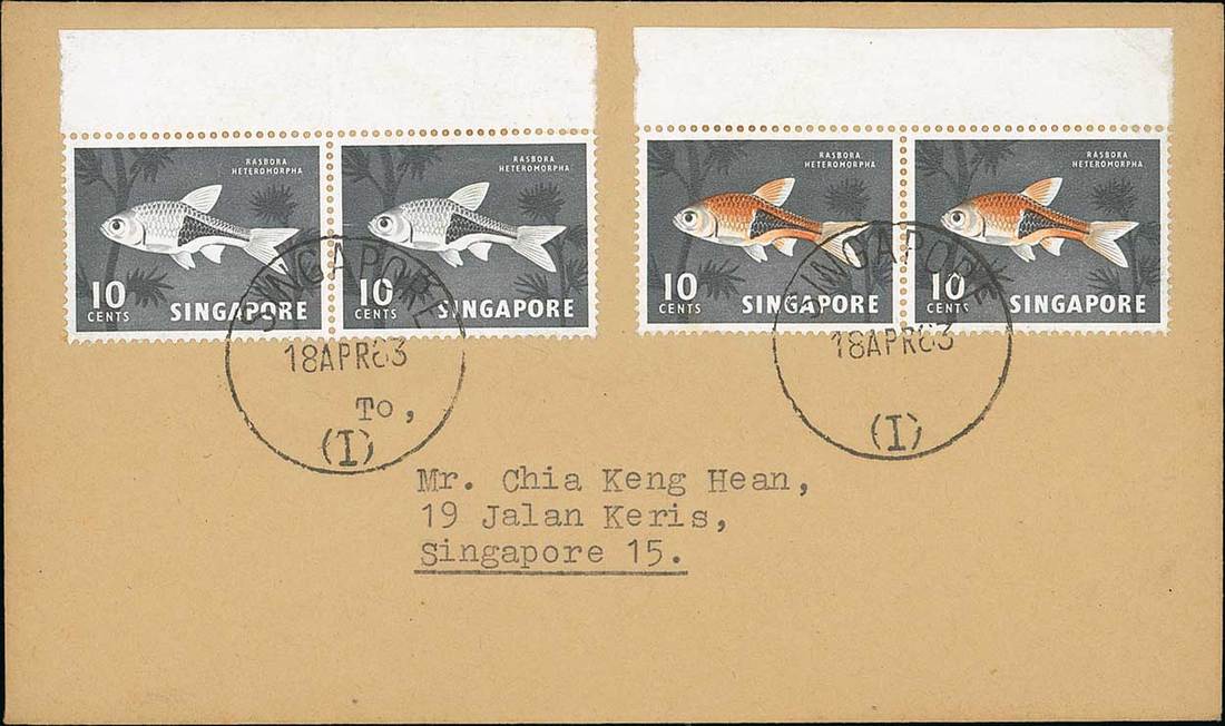 1962-66 10c. Harlequinfish, a pair with margin at top showing red-orange omitted, with matching normal pair on locally addressed 1963 (18 Apr.) envelope, fine. S.G. 69a, £850 off cover. Photo