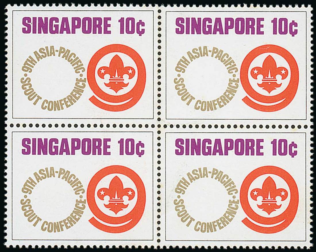 1974 (June) 9th Asia-Pacific Scout Conference 10c., a block of four showing major shift of gold to right, fine unmounted mint. With matching normal block for comparison. S.G. 233var