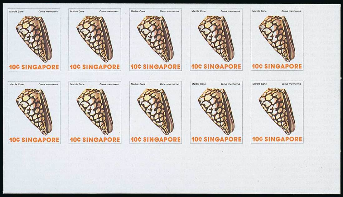 1977 (Apr.) Sea Shells 10c., a lower right corner block of ten (5x2), variety imperforate, fine unmounted mint. A rare multiple. S.G. 291a, £2500. Photo
