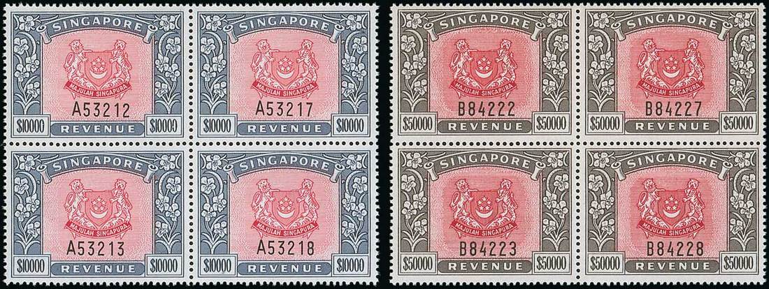 1982 Type IV $10,000 carmine and slate-blue and $50,000 carmine and grey-brown, with 1982 $25 to $2000 set of four, all in pristine unmounted mint blocks of four. Rare. Barefoot 32-35, 38,39, 46-49. Photo
