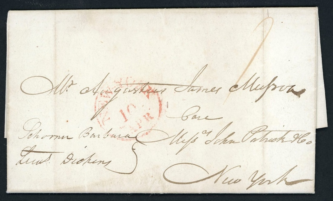 1811 (29 Mar.) "bootleg" entire letter per "Schooner Barbara, Lieut. Dickens" to New York, placed in the mails with prepayment of "1" c. drop letter rate and with arrival datestamp (10.4) on face