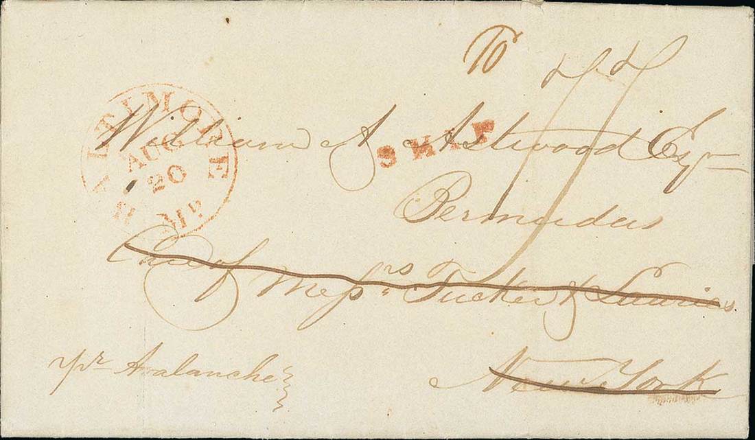 1838 (4 Aug.) entire letter from Guayama, Puerto Rico "pr Avalanche" via Baltimore and care of Tucker & Lawries in New York to William & Astwood, Bermuda, rated "77" cents and "10d" (5d. internal = 5d. incoming ship rate, both for up to triple weight) and showing Baltimore "ship" handstamp and datestamp (20.8), both in red, the reverse with manuscript "Postage Paid at New York by mail from Baltimore, & forwarded by Your Obet. St. Tucker & Lawries, New York 31st. Aug. 1838". An unusual item showing the rarely seen multiple 5d. Bermuda incoming ship rate. Photo