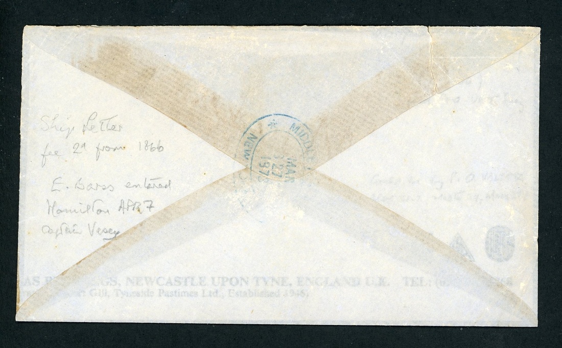 1873 (27 Mar.) envelope from New York "p E Barss" to J. Butterfield "Clerk H.M. Council" Bermuda, hand-delivered to and forwarded by Middleton & Co. with small dated handstamp in blue on reverse, manuscript "2" ship fee in blue crayon