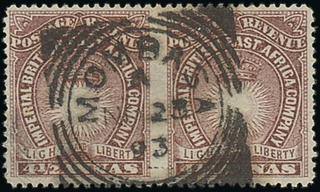 4½a. brown-purple imperforate between horizontal pair, sharing Mombasa 23 November 1893 squared-circle datestamp; scarce. S.G. 11ac, £950. Photo