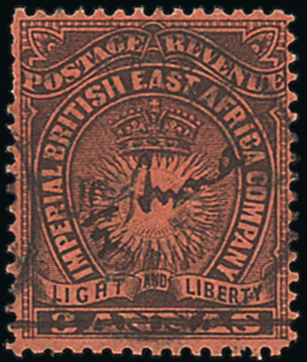 "½ Anna" on 3a. black on dull red lightly initialled "AB", neat datestamp; two short perfs. at upper left, otherwise sound. Rare. S.G. 24, £2,250. Photo