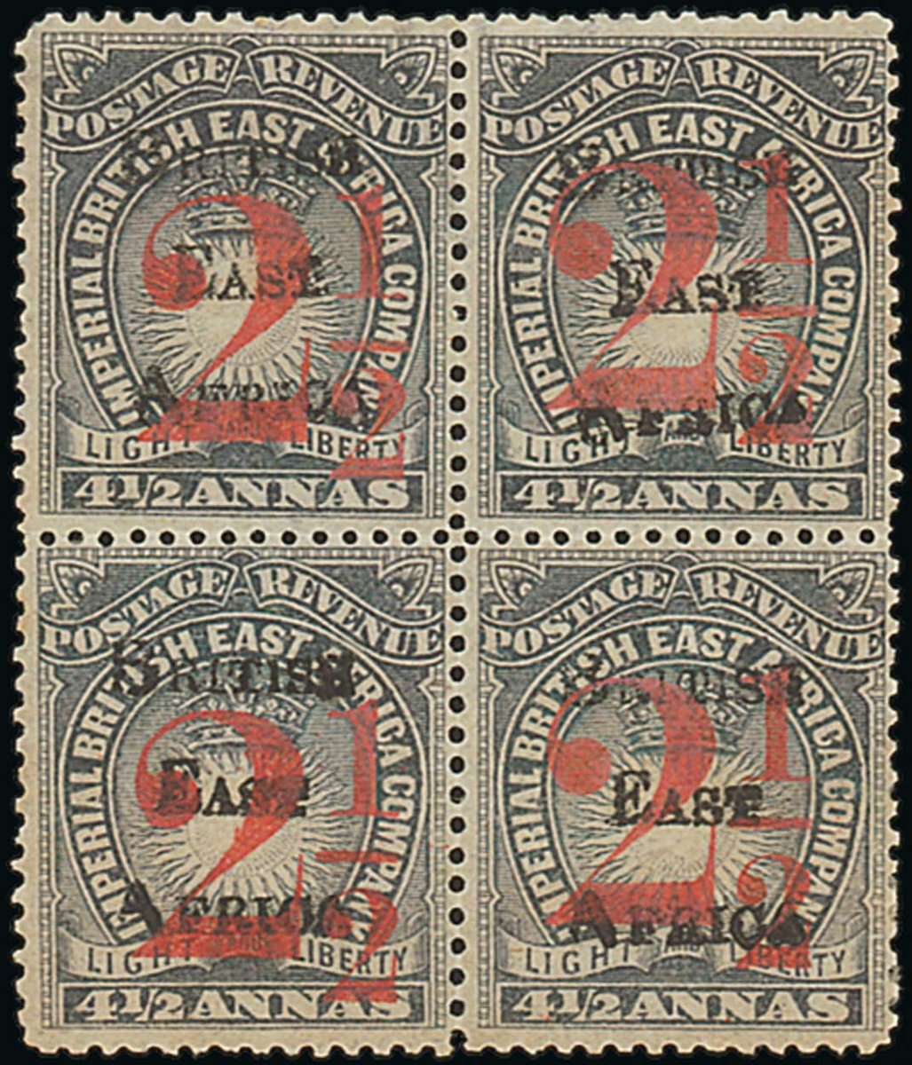 "2½" on 4½a. dull violet block of four, unused; overall toning though the equal largest multiple known with only three recorded, one in the Collection of Her Majesty the Queen. S.G. 48, £900+. Photo