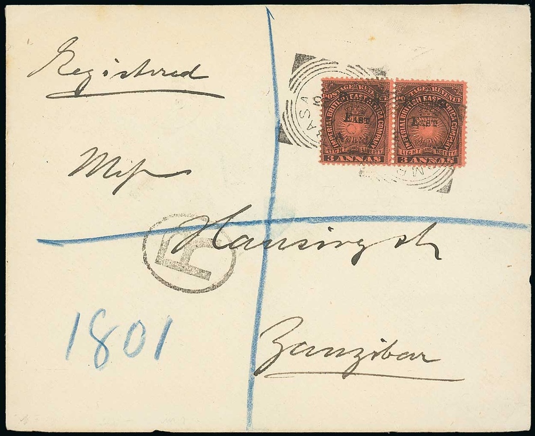1895 (23 Dec.) Hansing envelope registered from Mombasa to Zanzibar, bearing 3a. black on dull red horizontal pair neatly cancelled by squared-circle datestamp, showing "R" in oval handstamps and with arrival datestamp (25.12 with day and month inverted) on reverse. Photo