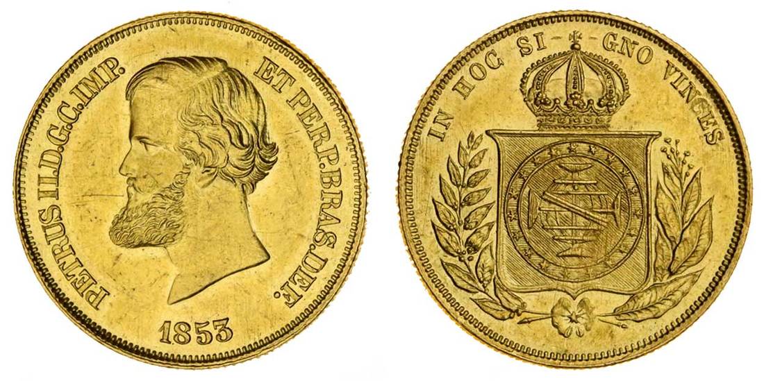 (g) Brazil, Empire, Pedro II (1831-89), 10,000-Reis, 1853, older beared head left, rev. crowned arms within wreath (F.122; KM.467), some light surface abrasions in fields, about extremely fine