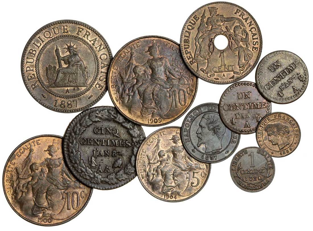 France, miscellaneous bronze coins (11), Republic, 5-Centimes L'An 8 AA, Centime (2), L'An 7A, L'An ?A, Second Empire, 2-Centimes 1857A, Republic, 1-Cent 1884A, 10-Cents (2), 1900, 1908, 5-Cents 1905, 1-Cent 1920 (KM.642.2, 646, 776, 826.1, 840, 842, 843), the early coins about fine, later issues very fine or better, French Indo-China 1-Cent (2), 1887, 1897 (KM.1, 8), extremely fine and about uncirculated, both with lustre (11)