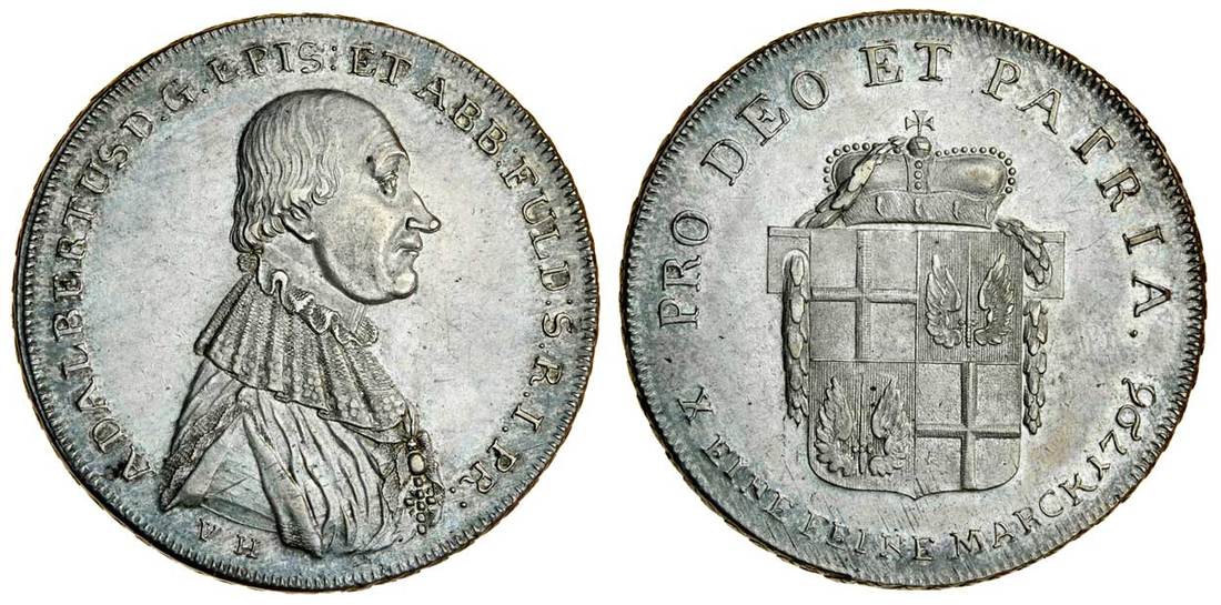 Germany, Fulda, Abbot Adalbert von Harstall (1788-1802), Taler, 1796, bust with ruffled collar right, rev. crowned arms (Dav.2264; KM.150), good very fine