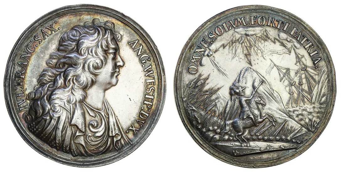 Germany, Saxe-Lauenburg, Julius Franz (1666-89), silver medal by J G Breuer, on the War against the Turks, undated (1678), bust right, rev. the Duke on horseback with an army before a mountain, ships being wrecked in a storm in the distance, 61mm. (Forrer i, 281), good extremely fine, very rare in this condition, in contemporary black shagreen case