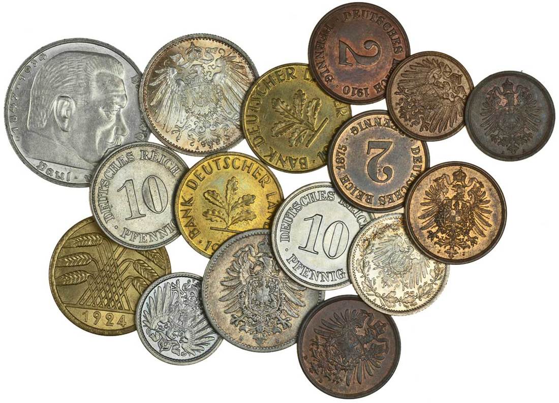 Germany, Empire, 1-Mark (2), 1874 e, 1907 a, ½-Mark, 1907 a, cu.ni.10-Pfennig (2), 1901 d, 1907 a, 5-Pfennig, 1907 a, AE 2-Pfennig (4), 1875 (3) a, d and j, 1910 a, Pfennig (2), 1886 a, 1904 j, Weimar Republic, al.br 50-Rentenpfennig, 1924 a, Third Reich, 5-Reichsmark, 1936 d, Federal Republic, brass-clad steel 10-Pfennig, 1949 (2), small and large j (KM.1, 2, 7, 10, 11, 12, 14, 16, 17, 34, 86, 103), the first Mark good very fine, other coins extremely fine or better (lot)