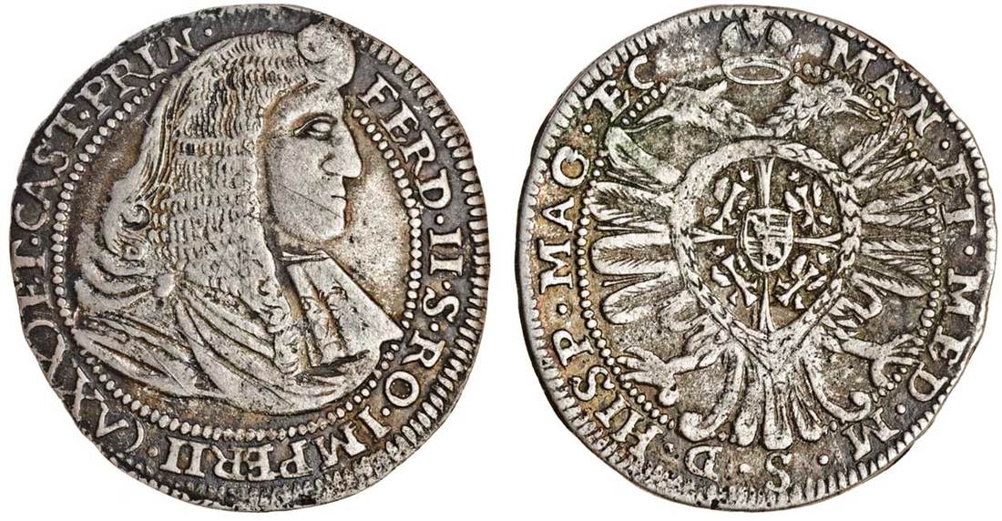 Italy, Castiglione delle Stiviere, Ferdinando II Gonzaga (1680-1723), 25-Soldi, undated, ferd. ii. ro. imperii. (xxv) et. cast. prin., bust right, rev. man. et. med. m.s.d.. hisp. mag. etc., shield on crowned double headed eagle (CNI.12/14; MIR.254), good very fine, old tone