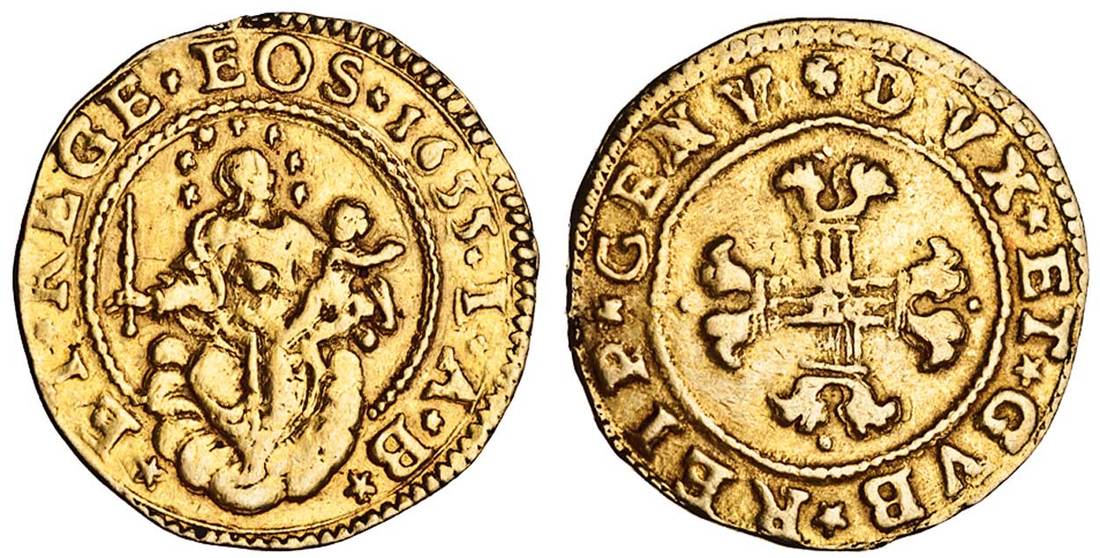 Italy, Genoa, Biennial Doges (third period, dated coinage 1637-1749), Half-Doppia, 1655, et. rege. eos. 1655. i.a.b., Madonna and Child seated on clouds, rev. dvx. et. gvb. reip. genv., cross fleury (CNI.4/5; F.432; Lun.265; MIR.262/6), from a mount, fine