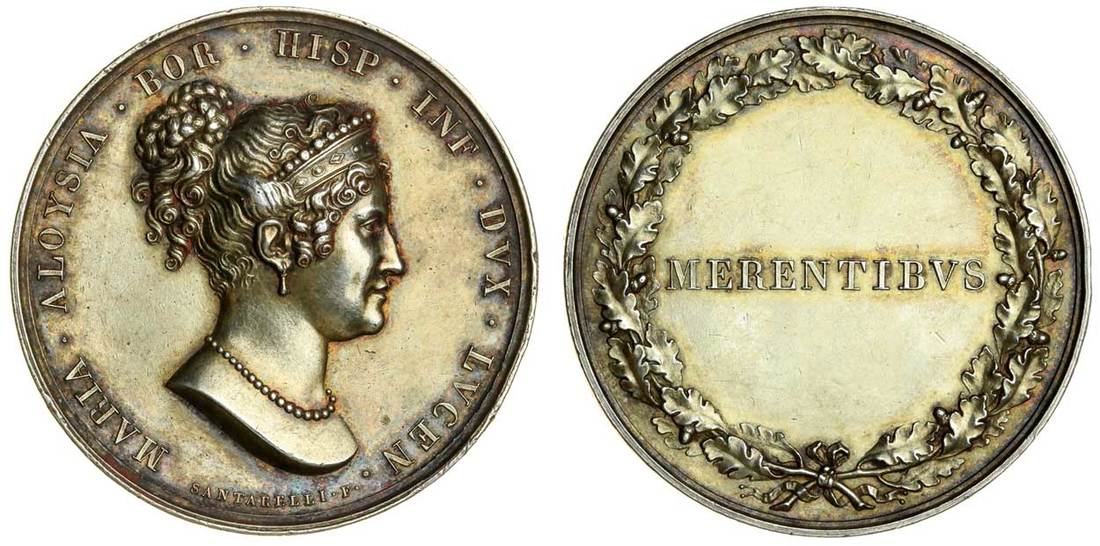 Italy, Lucca, Maria Aloysia de Borbone (Duchess 1817-24), silver gilt prize medal for merit, by Santarelli, 41mm, diademed bust right, rev. merentibvs within wreath (Forrer V, 335), pierced on side at top for suspension, good very fine