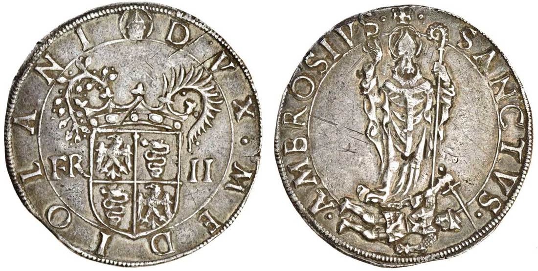 Italy, Milan, Fancesco II Sforza (IX Duke 1522-25), Grosso da 15 Soldi, 6.28g, dvx mediolani, crowned shield with branches of olive and palm, dividing fr-ii, rev. .sanctvs. .ambrosivs., St Ambrose standing, holding flail and crozier, trampling on armed warrior (CNI.16-17; Crippa 4; MIR.269-R5), some light scratches, good very fine, very rare