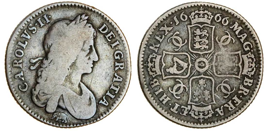 Charles II (1660-1685), Shilling, 1666, first bust variety right, elephant below, rev. crowned cruciform shields, interlinked cs in angles, Garter star at centre (ESC 507 (1026); S.3373), toned, nearly fine, rare