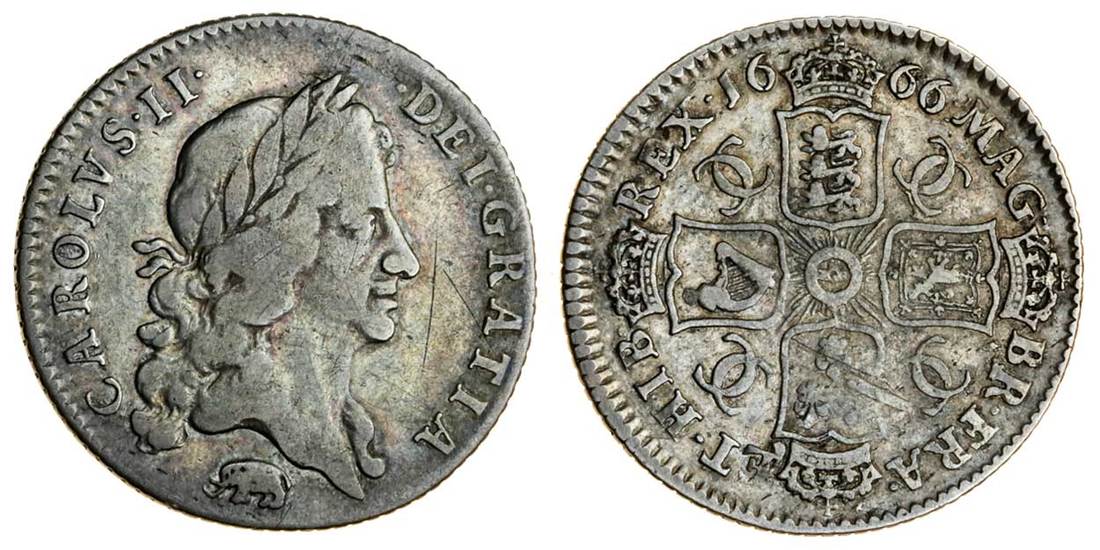 Charles II (1660-1685), Shilling, 1666, guinea bust right, elephant below, rev. crowned cruciform shields, interlinked cs in angles, Garter star at centre (ESC 509 (1027); S.3374), toned, fine, extremely rare