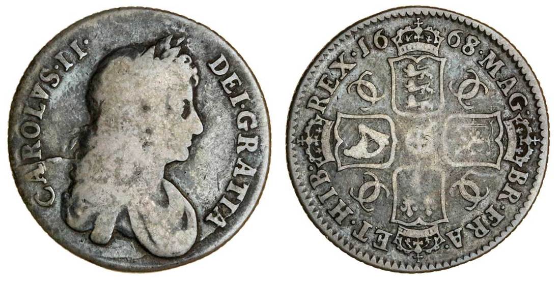 Charles II (1660-1685), Shilling, 1668/3, second bust right, rev. crowned cruciform shields, interlinked cs in angles, Garter star at centre (ESC 513 (1030A); S.3375), toned, fair/nearly fine, rare