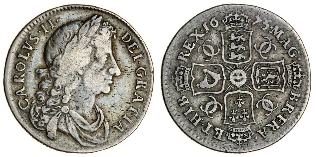 Charles II (1660-1685), Shilling, 1675/3, third bust right, rev. e/r in et, crowned cruciform shields, interlinked cs in angles, Garter star at centre (ESC 531 (1043A); S.3380), toned, a bold fine, very rare