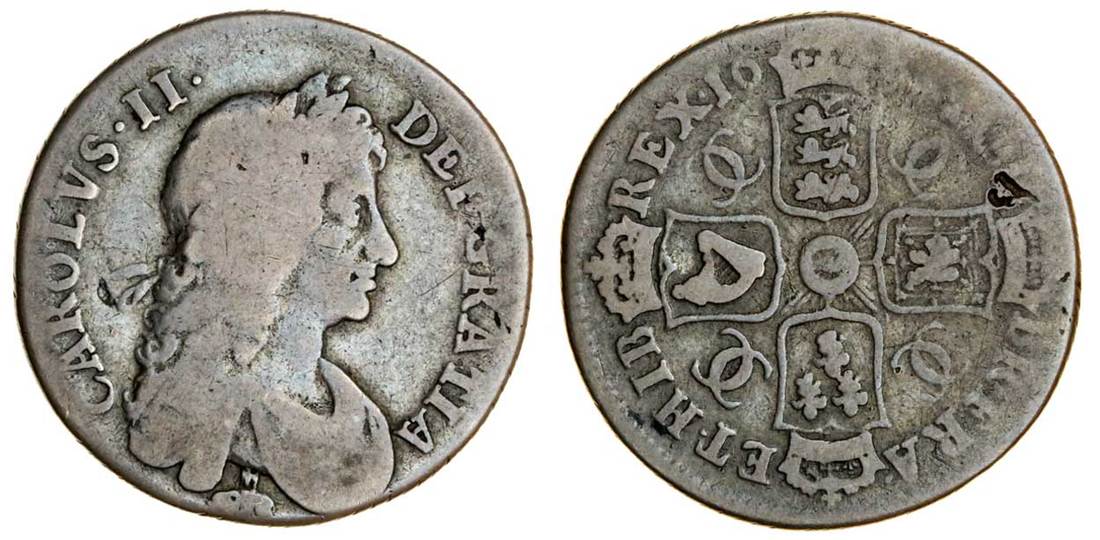 Charles II (1660-1685), Shilling, 1681/0, second bust right, elephant and castle below, rev. crowned cruciform shields, interlinked cs in angles, Garter star at centre (ESC 555 (1062); S.3379), digs to the reverse and the last two digits of the date worn away, otherwise toned, fair or slightly better, extremely rare in any grade