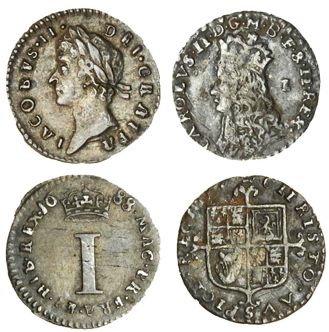 Charles II (1660-1685), Penny, undated Maundy, mm. -/crown, 0.36g, crowned bust left, mark of value behind, rev. square topped shield over long cross fourchée; James II (1685-1688), Penny, 1688/7, laureate head left, rev. crown above value (ESC 589 (2272), 816 (2297); S.3320, 3410), the first with surface marks, good fine to good very fine (2)