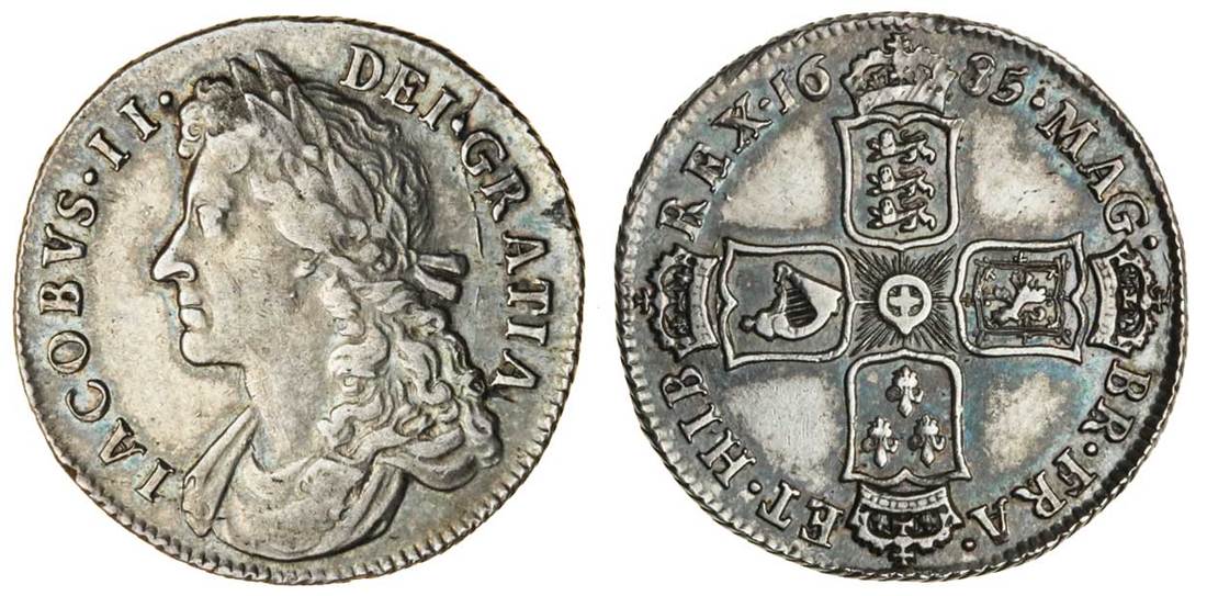 James II (1685-1688), Shilling, 1685, laureate and draped bust left, rev. crowned cruciform shields, plain angles, Garter star at centre (ESC 760 (1068); S.3410), sometime cleaned, very fine