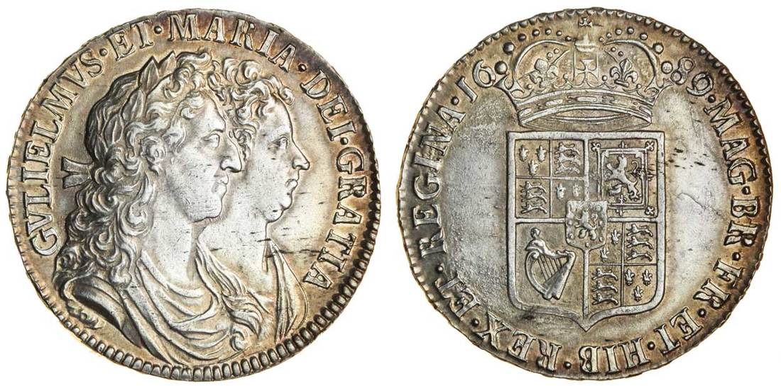 William & Mary (1688-1694), Halfcrown, 1689 primo, first busts right, rev. second crowned square topped shield, caul frosted, pearls (ESC 839 (510); S.3435), good very fine