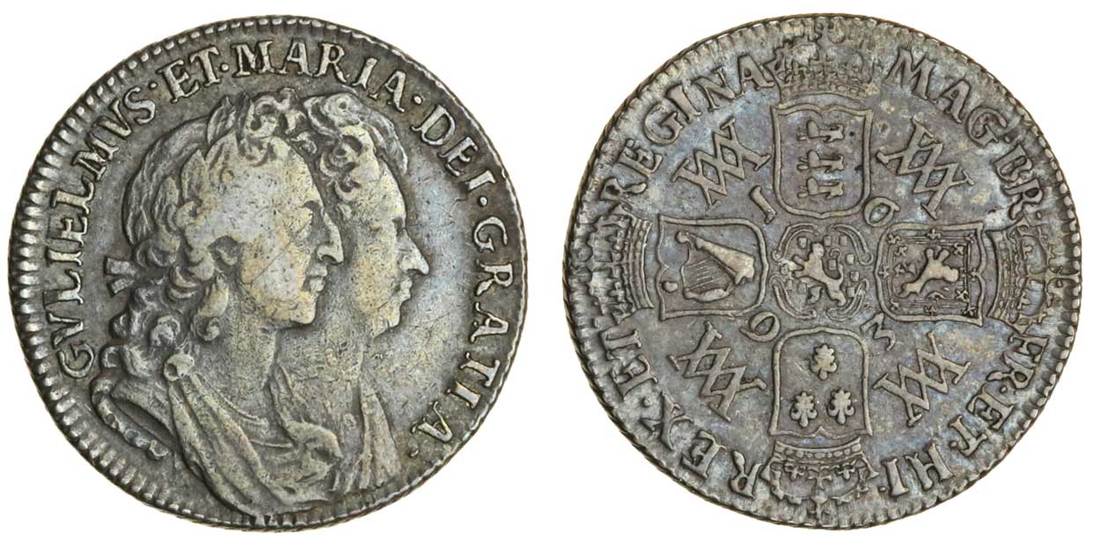 William & Mary (1688-1694), Shilling, 1693, conjoined busts right, rev. crowned cruciform shields, wm monogram in angles, date around lion of Nassau at centre (ESC 868 (1076); S.3437), toned, good fine