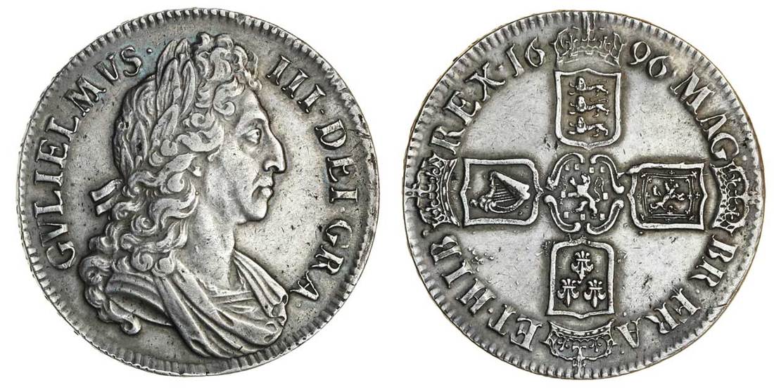 William III (1694-1702), Crown, 1696 octavo, third bust right, rev. crowned cruciform shields, early harp, plain angles, lion of Nassau at centre (ESC 1004 (94); S.3472), better than very fine