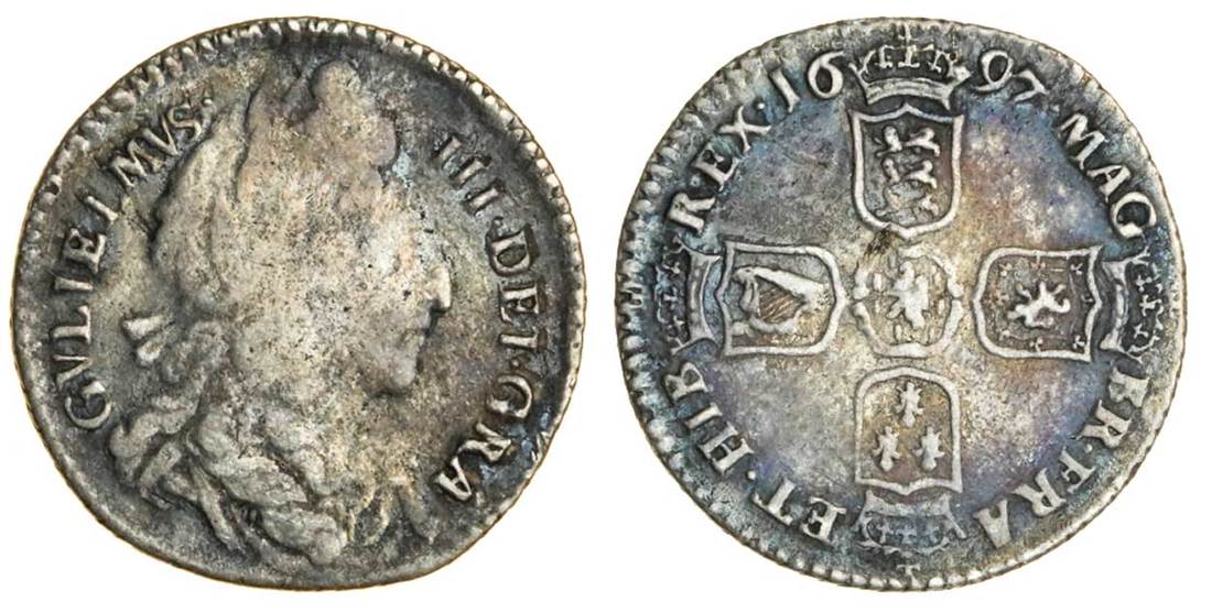 William III (1694-1702), Sixpence, 1697, second bust right, rev. small crowns, late harp (ESC 1224 (1564); S.3537), toned, fair/fine, rare